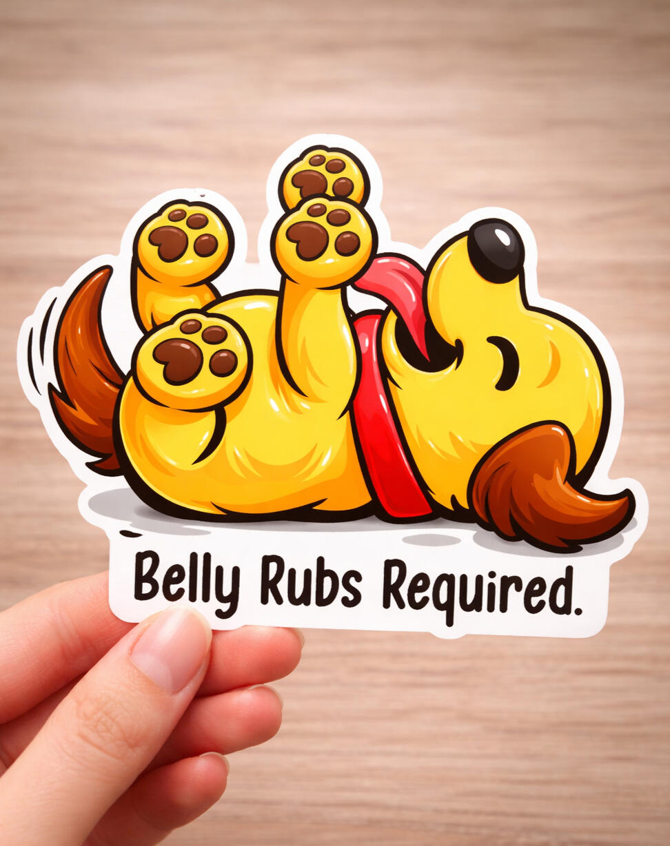 We've designed a belly-up, tail-wagging, attention-demanding dog sticker just for you.We hope this sticker makes you smile and reminds you of your favorite goofy, belly-rub-loving pup. Stickers ship in 1–2 weeks via USPS. Thanks a ton!